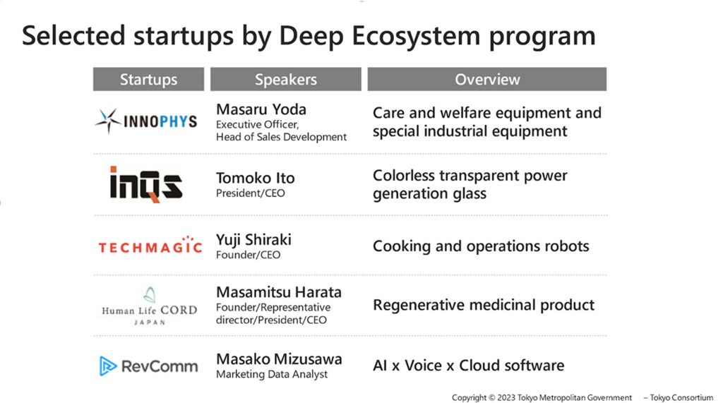 この様な状況の下、東京コンソーシアムでは海外展開を視野に入れユニコーン級へ成長すると期待されるスタートアップ5社を2022年度の「ディープ・エコシステム」支援対象企業として採択し約半年の支援成果を含め今回のDemo Dayでプレゼンテーションしました。