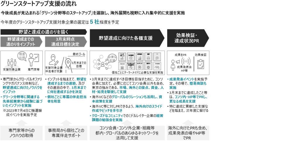 「グリーンスタートアップ支援」は、海外展開を視野に入れ、今後急成長が見込まれるスタートアップを選抜の上で集中的に支援し、スタートアップの目標達成を後押しする東京コンソーシアム独自の取組です。選定された企業に対して、国内のみならず海外展開を視野に入れ、国内外のベンチャーキャピタル・機関投資家や、先輩スタートアップなど、東京コンソーシアムの集積とネットワークを活かした多様なメンバーによる支援を実施いたします。