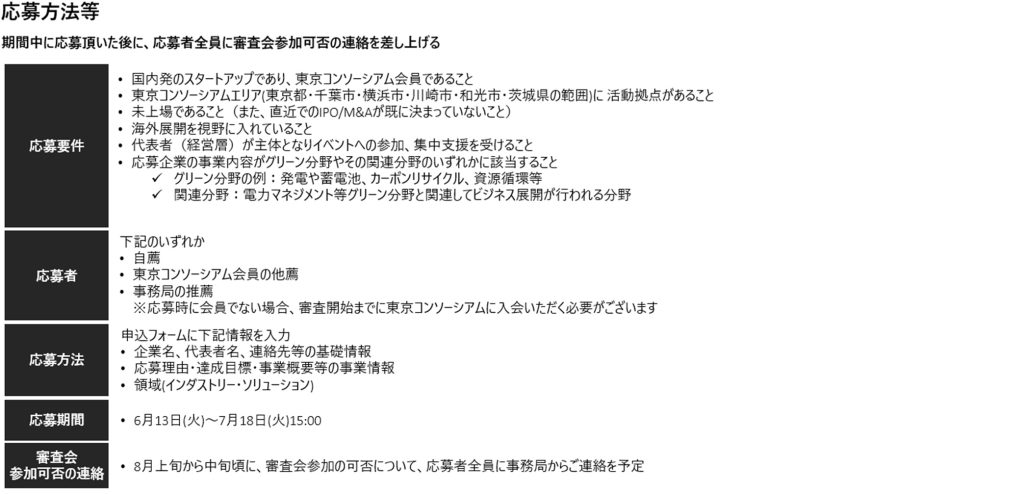 「グリーンスタートアップ支援」は、「国内発のスタートアップであり、東京コンソーシアム会員であること」が応募要件の一つとなっています。現時点で東京コンソーシアムの会員でなくとも、東京コンソーシアムの趣旨にご賛同いただけましたら、ご入会いただけます。会費は無料です。